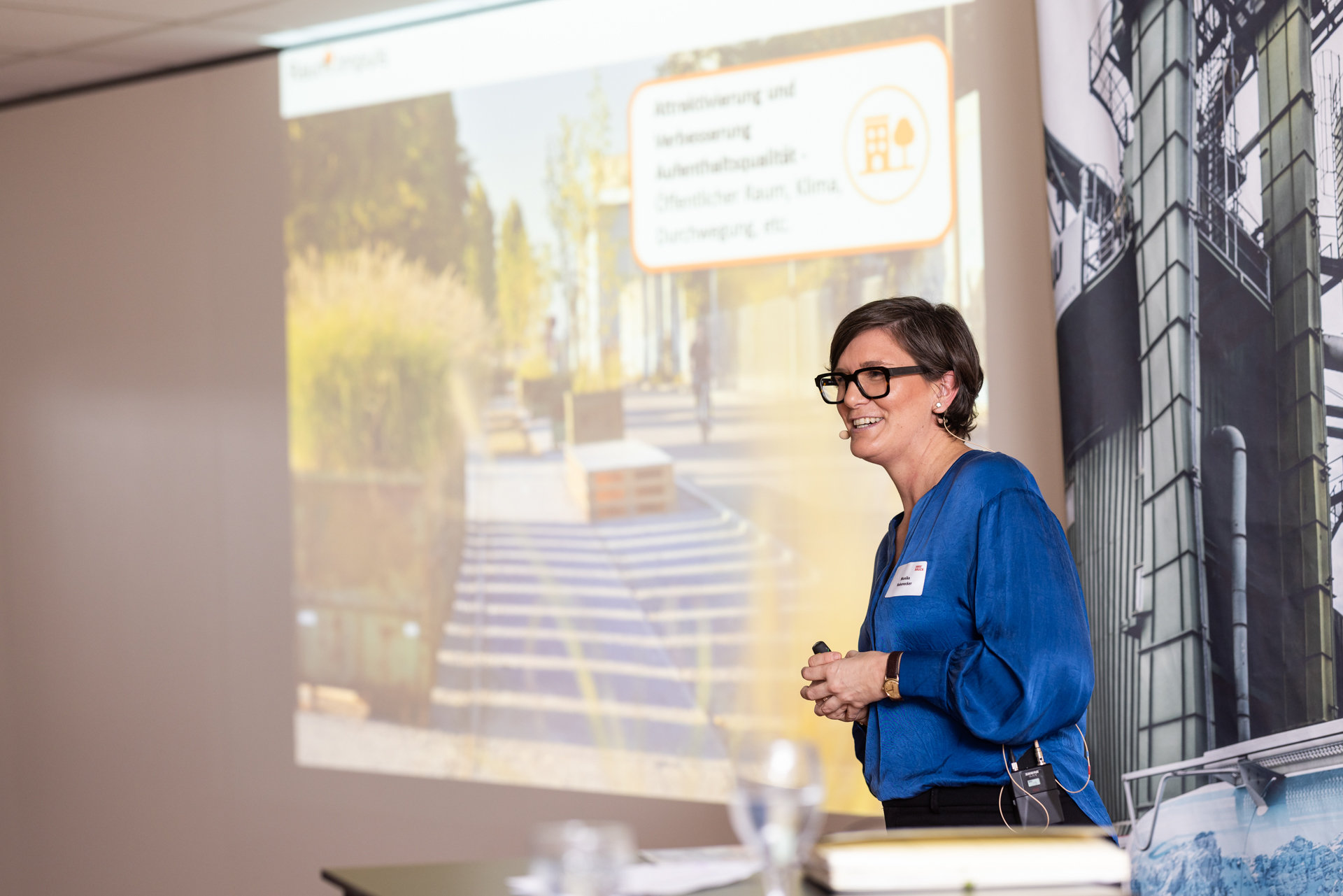 Monika Hohenecker öffnete in ihrer inspirierenden Keynote den Blick auf vergleichbare Quartiersentwicklungen. Sie gab spannenden Einblicke, wie Gewerbegebiete von morgen gestaltet werden können und wie es gelingt, die durchaus unterschiedlichen Bedürfnisse der relevanten Stakeholder unter einen Hut zu bringen.
